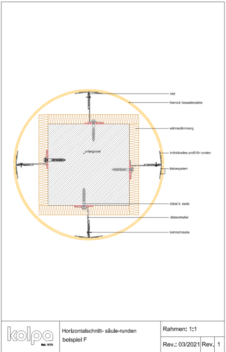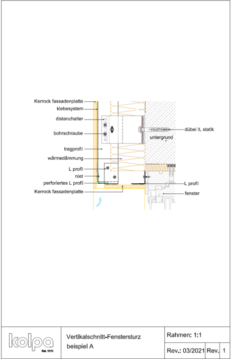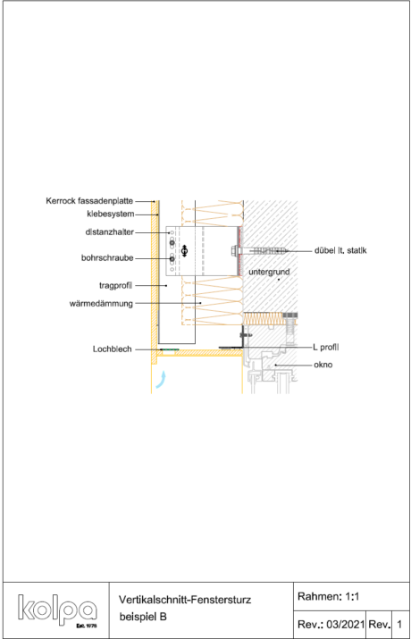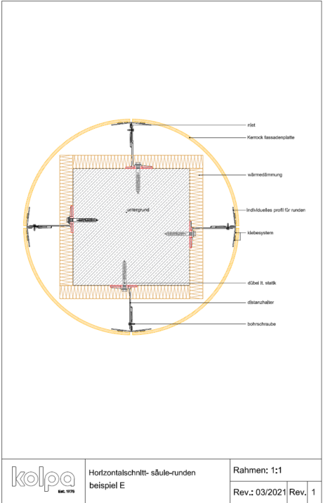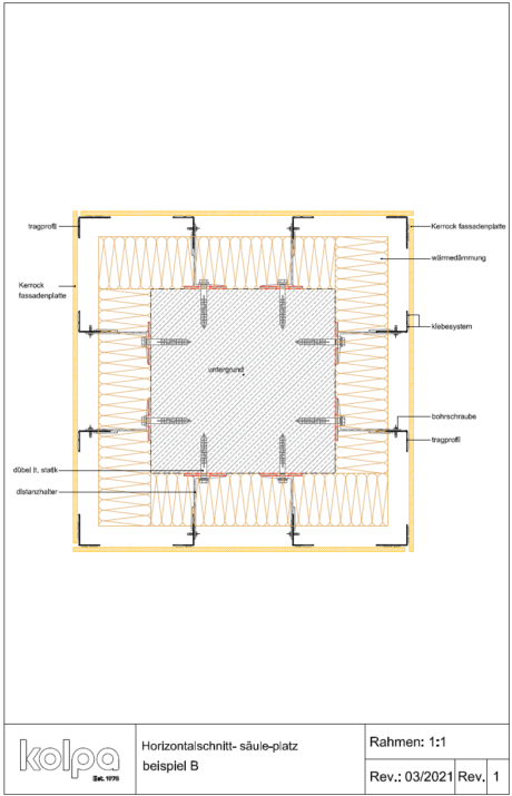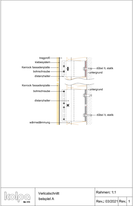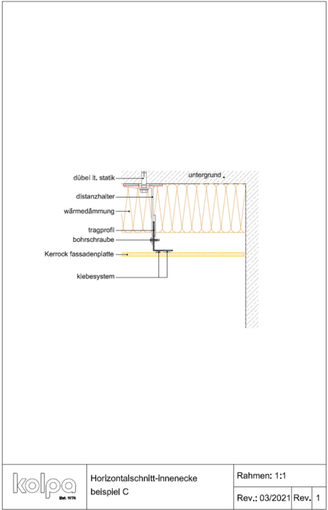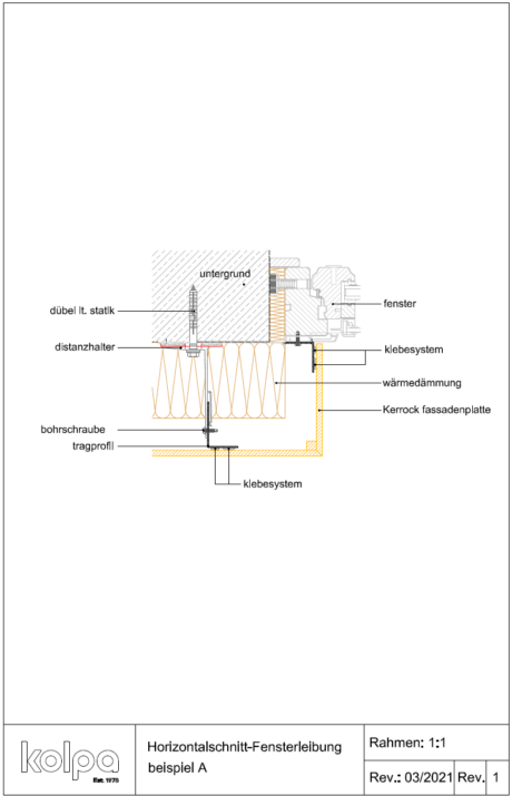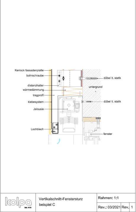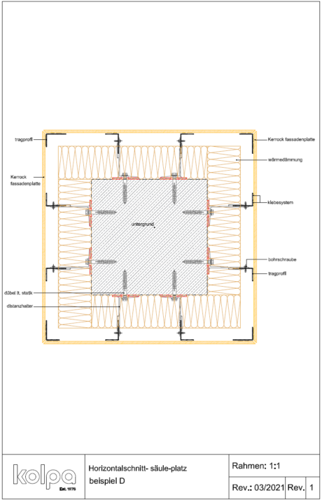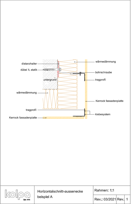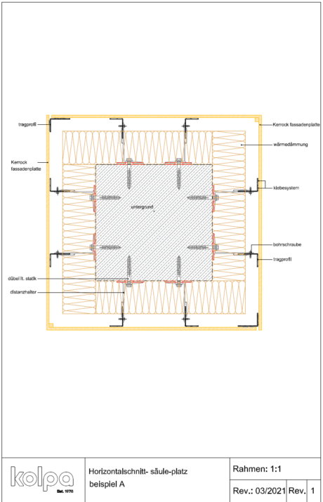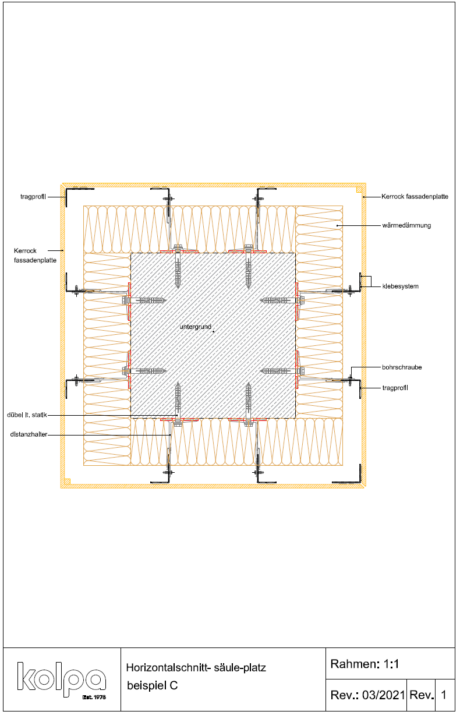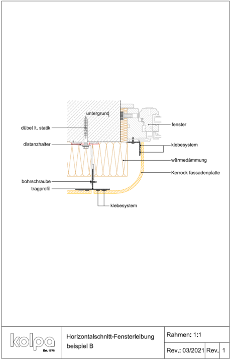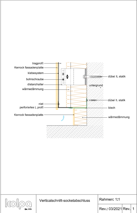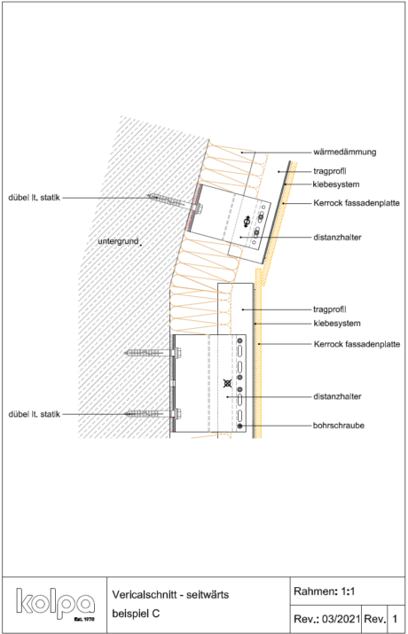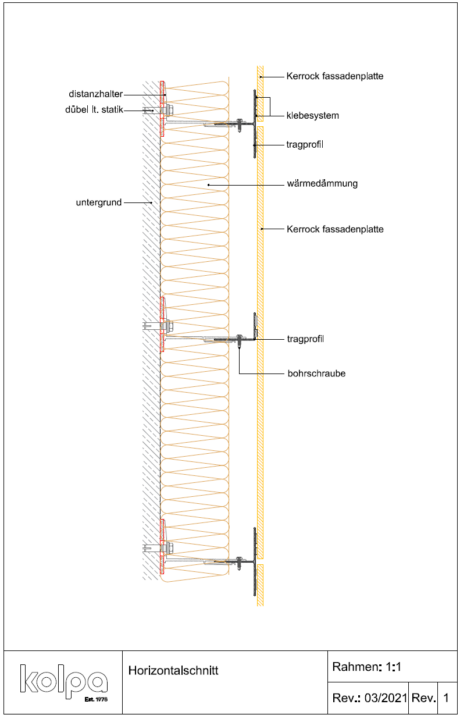 Horizontaler Querschnitt des typischen hinterlüfteten Fassadensystems mit geklebter Außenverkleidung.