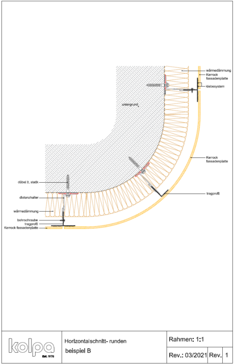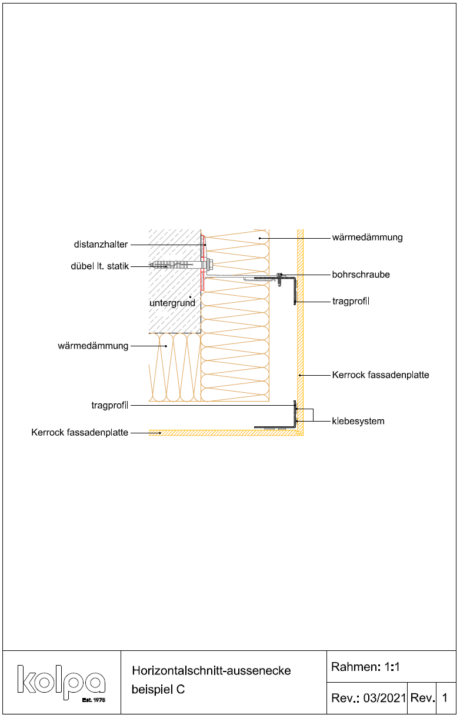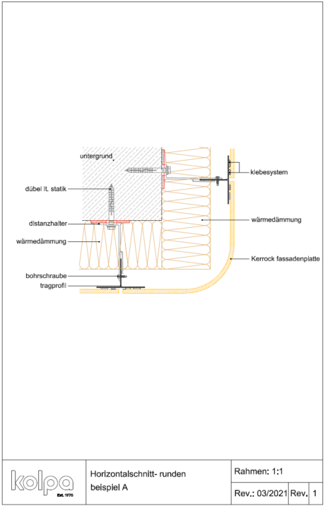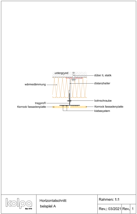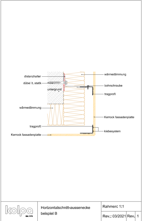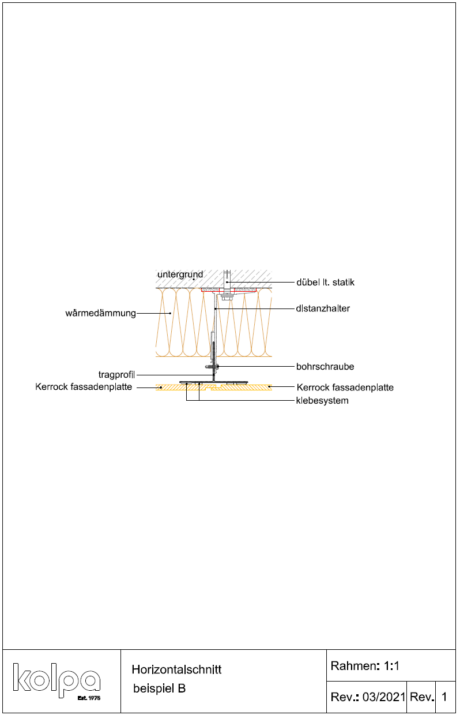 Das hinterlüftete Fassadensystem von Kerrock ist auf dem horizontalen Querschnitt auf dem Bild 1 dargestellt. Die Haupt-Aluminium-Unterkonstruktion wird mit einer Befestigungsschraube an der Betonunterlage befestigt. Anschließend wird eine Wärmedämmschicht aus nicht brennbaren Materialien eingelegt, wobei zwischen der Außenfassade und der Wärmedämmung eine Luftschicht zur Belüftung und Feuchtigkeitsableitung entsteht.